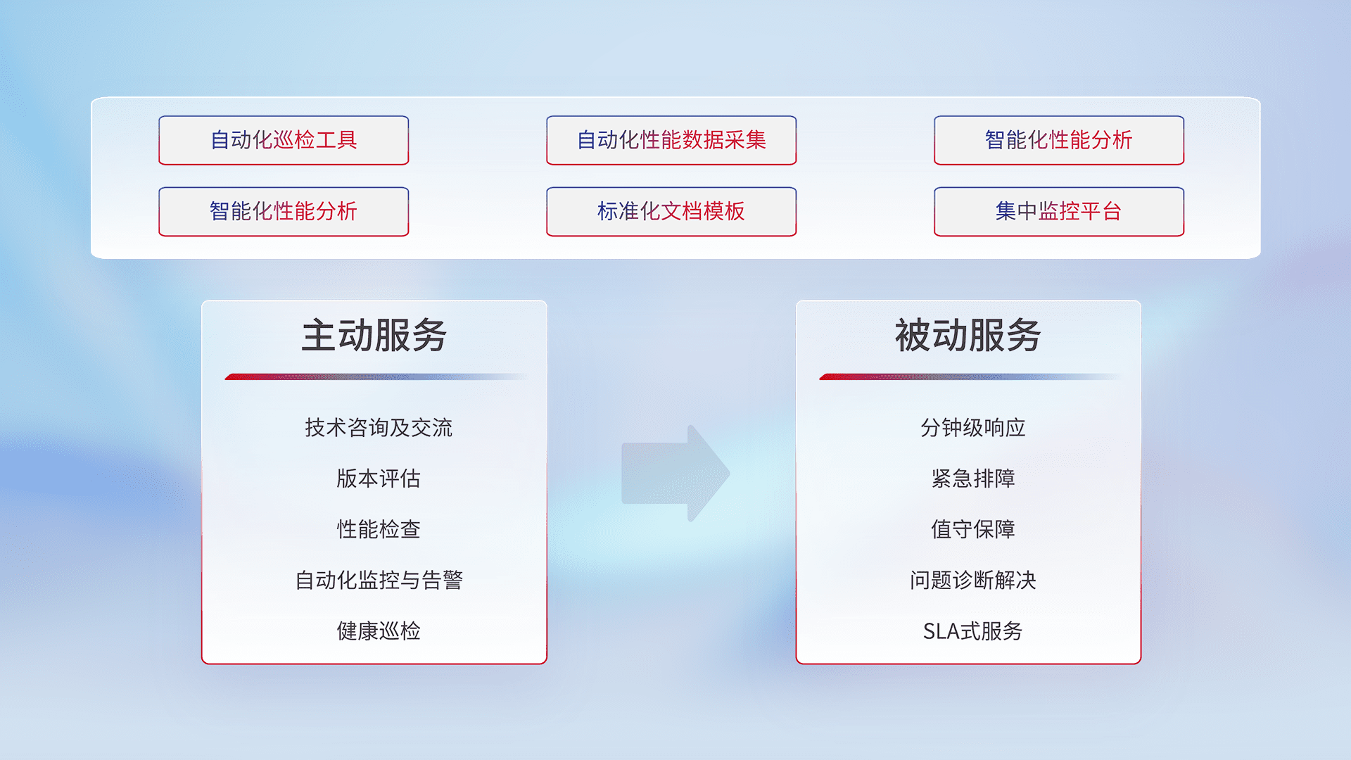 智能化工具和标准化文档,,保障服务质量,,提供主动服务(包含技术咨询、、、版本评估、、、、性能检查、、、自动化监控与告警、、、、健康巡检)和被动服务包含(分钟级响应、、紧急排障、、值守保障、、问题诊断解决、、、SLA服务)。。。。